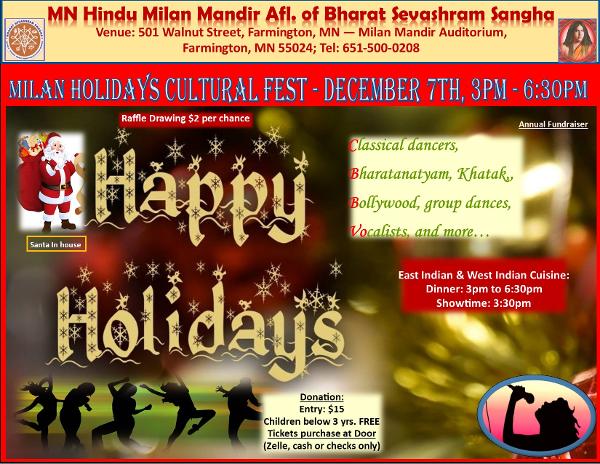 Please join the Milan Family to enjoy a fresh start of the Holidays and enjoy delicious ethnic delicacies and dinner, while you enjoy an evening of bollywood, classical dancing and singing - Date: Sunday, December 7th; Time: 3:00 pm to 6:30 pm. 100% of your donations goes to pay Milan Mandir winter bills. You don't want to miss this treat!